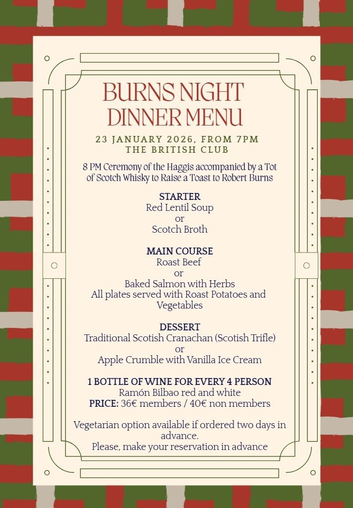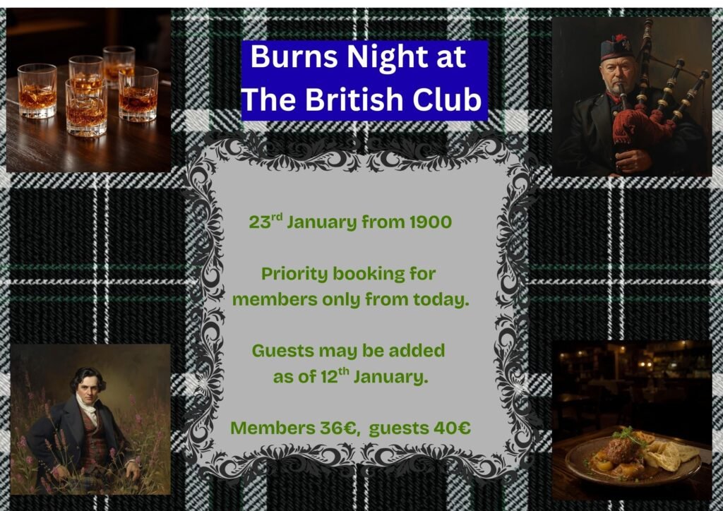 Celebrate Burns Night with us, enjoy traditions from north of the border, haggis, whisky and bagpipes. Booking essential, please note that members have priority for bookings up to January 12th at which point guests can be invited. Cost 36€ for members, 40€ for non-members. Please provide your membership number when booking.